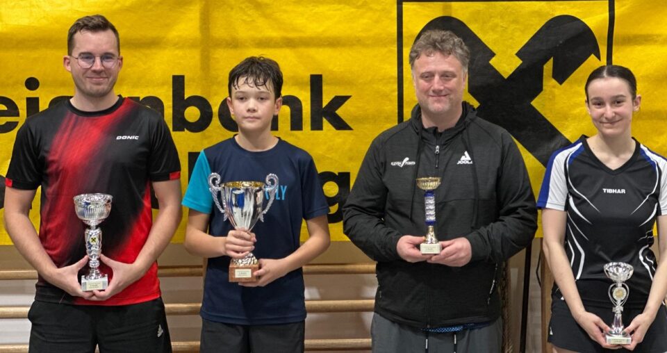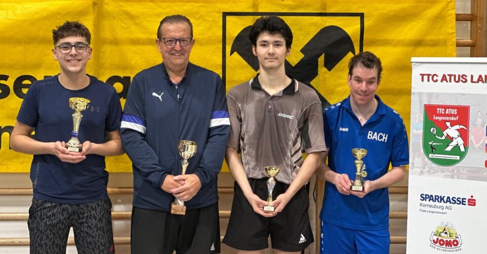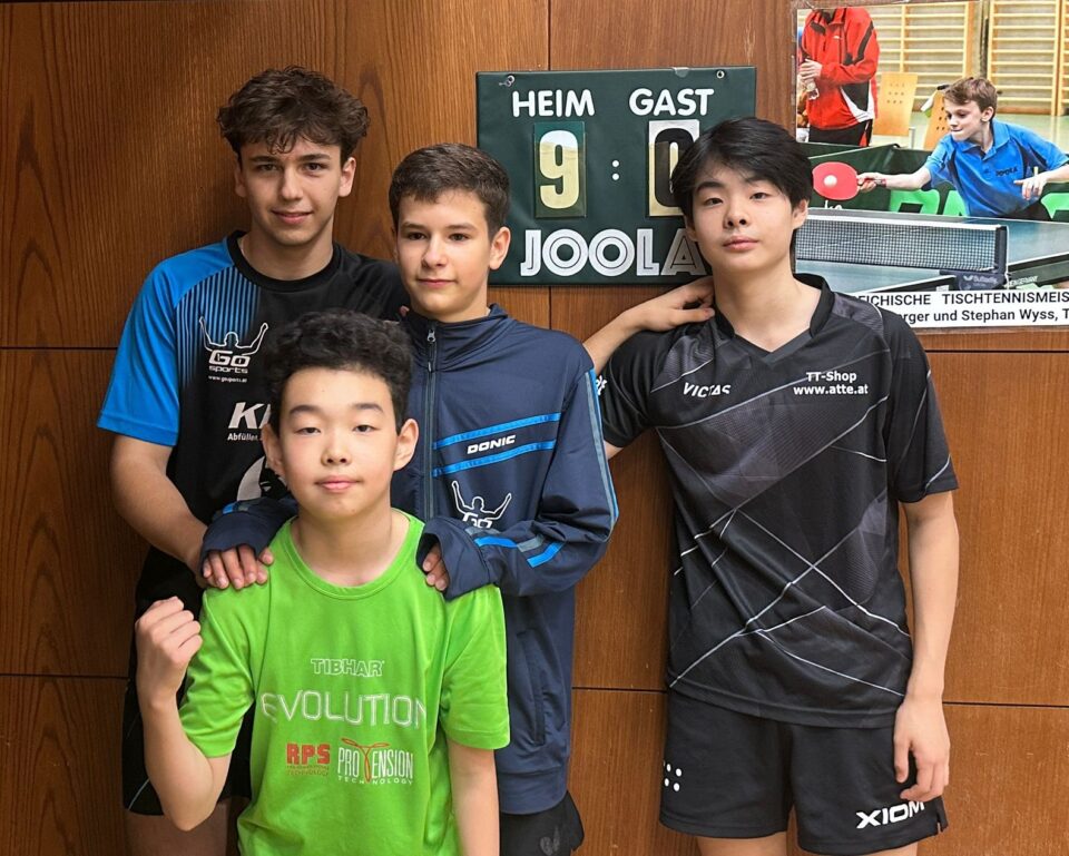 Am Samstag, dem 8.11.2025, fand der Herbstdurchgang der WTTV-Mannschaftsmeisterschaft U15 und U19 statt. Wir waren mit insgesamt sechs Mannschaften am Start – und alle Teams sorgten wieder für sehr positive Resultate. In der U19-Liga sorgte unsere 1. Mannschaft (im Foto oben rechts Jan Kolbert, Chen Sung Bin, Kyrylo Nakonechny und Chen Seung) für einen überaus souveränen Herbstmeistertitel, alle Spiele wurden 3:0 gewonnen; wir kamen dabei nie in Schwierigkeiten. Wesentlich enger ging es da in der U15-Liga zu. Wir mussten dabei auf einige unserer stärksten Spieler verzichten, dennoch liegen nach dem Herbstdurchgang zwei unserer Mannschaften in Front. Die 1. Mannschaft mit Lind Leitner und Timo Seilern-Chiereghin haben derzeit die Nase ganz knapp vorne, punktegleich folgt unsere 3. Mannschaft mit Lukas-Jakob Stoier und Emil Kuch – ein einziges Einzel trennt derzeit diese beiden Teams. Die Mannschaft der Naturfreunde Stadlau überwintert zwei Punkte dahinter auf Rang 3, punktegleich mit unserer 2. Mannschaft (Gavrilo Jovanovic, Uros Jovanovic), die gleichzeitig das jüngste Team stellt und vor allem im letzten Spiel gegen NFS überaus positiv überraschte. – Aber nicht nur in der Liga gab es positive Ergebnisse, auch in der jeweiligen Gruppe-I sorgten unsere Mannschaften für sehr gute Resultate. In der U19-I belegte unsere 2. Mannschaft mit Nicolas Piroue und Alexander Filzmoser den sehr guten 2. Platz, ebenfalls Zweite wurde unsere 4. Mannschaft in der U15-I (Patrick Dragusin, Niklas Gold, Jonas Mayer). Großartig!!