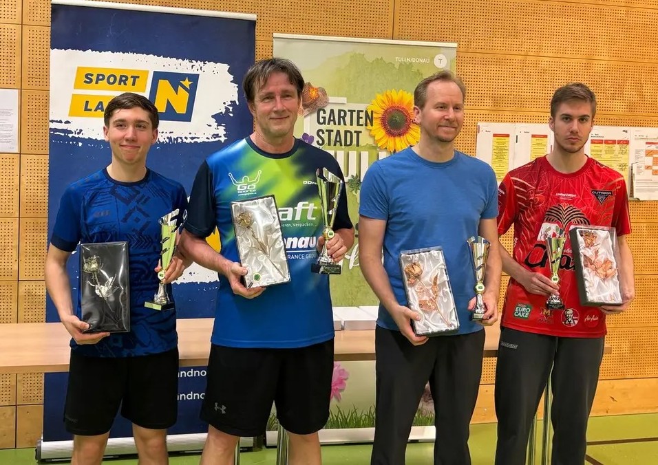 Einige unserer Spieler nahmen am Tischtennisturnier in Tulln teil, die 2. Gartenstadt Tulln Trophy, und das durchaus erfolgreich. Im Hauptbewerb ging es um die „Goldene Rose der Stadt Tulln“, und diese durfte Vladimir Baca mit nach Hause nehmen. Er besiegte im Endspiel Jakob Hauss aus Wolfpassing. Nikolaus Hornik belegte den sehr guten 3. Platz (gemeinsam mit Christian Ritter) und wurde dafür mit der „Rose in Bronze“ ausgezeichnet. Dazu gab es noch schöne Pokale. Insgesamt waren an diesem Turniertag 85 Spieler von 40 Vereinen im Einsatz.