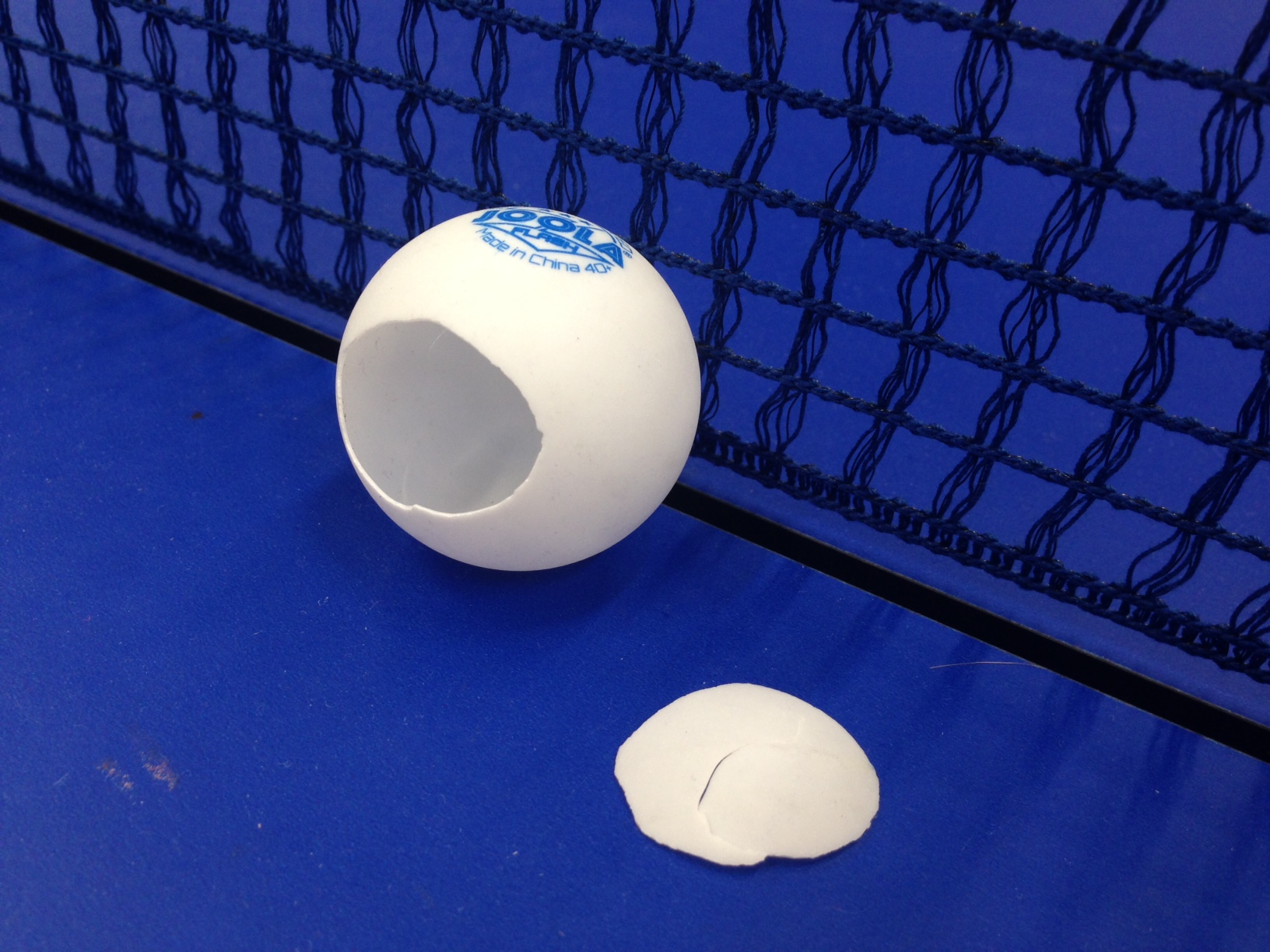 Im abgebildete Bild ist ein Ball zu sehen, dem während eines Topspinduells ein Teil herausgebrochen ist.